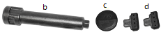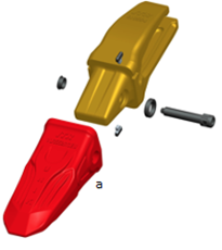 Zuby UNIK, které lze použít na jakýkoli adaptér bez nutnosti úprav. Tyto zuby mají inovativní samoostřící profil, který zajišťuje vysoký výkon a delší životnost (o 20–30 % delší než u jiných zubů); b. čep; c. plastový kryt; d. dva T-držáky.